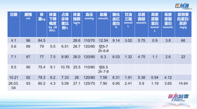 诊疗过程:初始诊断为2型糖尿病、肥胖症、血脂异常、微量蛋白尿。采用“生活方式干预 + 三联降糖药物”方案,生活上嘱戒烟、控饮食、快走;药物用司美格鲁肽、达格列净、二甲双胍。4周随访有轻度消