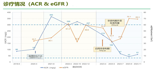 上海市第一人民医院治疗2型糖尿病相关慢性肾脏病经验分享 Case sharing 现病史 患者于11+年前因“口干、多饮、多尿、伴体重下降”就诊,明确诊断“2型糖尿病”,给予二甲双胍、阿卡波糖、格列齐特缓释片等降糖治疗。6+年前因“血糖控制不佳”入院,检查发现HbA。9.9%,空腹血糖14.5mmol/L,胰岛功能差,给予门冬胰岛素30联合阿卡波糖控糖;并首次发现微量白蛋白尿(UACR 86 mg/g),嘱严格生活方式干预(饮食运动疗法)并严格控糖。此后患者定期随访,整体血糖控制尚可。3+年前患者因“双下肢麻木”再次住院时,发现持续微量白蛋白尿较前增加(UACR101 mg/g),肾功能下降明显(血肌酐198wmol/L,eGFR 33.7 ml/min/1.73m2),血脂升高明显(甘油三酯2.23 mmol/L,总胆固醇6.85mmol/L,其余血脂相关指标未见异常),眼底检查显示眼底硬性渗出,故调整治疗方案,停用阿卡波糖,改为在胰岛素(门冬胰岛素30注射液 20u ih早餐前、18u ih晚餐前)基础上联用DPP-4抑制剂,并启用SGLT2抑制剂(达格列净10mgqd),加用阿托伐他汀调脂此后患者血糖控制良好,维持原降糖治疗方案,但白蛋白尿逐渐加重,2+年前由微量进展为大量白蛋白尿(2022年4月,24小时尿蛋白定量312mg/24h;2022年4、10、12月,UACR分别为298mg/g、326 mg/g、297mg/g),伴血肌酐升高,eGFR波动于30~60ml/min/1.73m2(2022年4、10、12月,血肌酐分别为119 wmol/L、201wmol/L、122 wmol/L; eGFR 分别为61.4ml/min/1.73m , 32.6 ml/min/1.73m?,59.6ml/min/1.73m2)。糖尿病周围神经病变症状时轻时重,眼底检查显示渗出持续存在,未见微血管瘤及出血点。陆续加用肾炎康复片、羟苯磺酸钙、阿魏酸哌嗪、胰激肽原酶、依帕司他等传统并发症治疗药物,症状缓解不明显。患者UACR波动在300mg/g左右,在“微量白蛋白尿”和“大量白蛋白尿”之间反复横跳。现为进一步改善蛋白尿及肾功能就诊。 实验室及辅助检查 体格检查: 血压130/78 mmHg,体重68 kg,BMI 25.28kg/m2,腰围94cm。足背动脉搏动可,双下肢针刺觉、温度觉、振动觉、压力觉未见明显异常 辅助检查: 眼底检查:眼底可见渗出,未见微血管瘤及出血点。 颈动脉彩超: 颈总动脉内膜厚度不均匀,右侧颈总动脉分叉处最后16.8mm×3.0 mm,左侧颈总动脉后壁最厚处10.2mm×2.2 mm。 既往诊断 2型糖尿病 糖尿病合并慢性肾脏病(G3aA2期) 糖尿病周围神经病变 糖尿病视网膜病变(非增殖期) 治疗方案 经综合管理血糖、血脂、血压,UACR仍逐渐增加,为进一步管理白蛋白尿,保护心肾,减少靶器官损伤,经与患者沟通,建议启用非奈利酮进行治疗。根据目前指南推荐及说明书要求,起始非奈利酮需评估患者血清钾水平,根据eGFR水平选择低剂量10 mg qd或标准剂量20mg qd起始,在开始治疗后4周内检测血钾并调整剂量。起始时(2023年4月),该患者血钾水#<4.8 mmol/L, eGFRIE F60 ml/min/1.73m2(54.8 ml/min/1.73m2),故选择非奈利酮起始剂量为10 mg qd。 随访 随访复查(2023年5月) 非奈利酮治疗1个月后随访(2023年5月),复查血钾<4.8 mmol/L, eGFR 32.3 ml/min/1.73m?,较1个月前有明显下降,但蛋白尿缓解明显(UACR从216mg/g降至168 mg/g),姚婷副主任医师建议维持方案,嘱患者继续随访。但患者随后因购买不到药物陆续停用肾炎康复片、胰激肽原酶和依帕司他,深感焦虑。通过线上随访,患者多次表达了对自身肾功能的担心,并自行将非奈利酮剂量上调为20 mg qd。作为主管医生,姚婷副主任医师一方面充分理解患者对自身健康的关注与期待,安抚患者的焦虑情绪,另一方面也对患者进行了教育和反复沟通,要求患者在当地也需密切监测肾功能指标,如有问题随时联系。 随访复查(2023年7月) 非奈利酮治疗3个月后随访(2023年7月),患者白蛋白尿进一步下降,UACR 67 mg/g,血肌酐178wmol/L,eGFR 37.5 ml/min/1.73m2,电解质未见异常,肾功能轻微回升。患者对疗效很满意,继续维持治疗。 随访复查(2023年9月) 非奈利酮治疗5个月后随访(2023年9月),UACR下降至43 mg/g,血肌酐下降至106 wmol/L,eGFR上升至70.1 ml/min/1.73m2,患者自觉双下肢乏力、麻木症状缓解。 随访复查(2023年11月) 非奈利酮治疗7个月后随访(2023年11月),患者eGFR维持在69.3 ml/min/1.73m2, UACR 61mg/g,患者对治疗效果非常满意。 患者自首次发现白蛋白尿以来,至启用非奈利酮治疗后的尿蛋白和肾功能变化情况如图1所示。可见,在启用非奈利酮治疗后,患者白蛋白尿快速改善并维持在较低水平,eGFR在经历一过性下降后也逐渐恢复并改善至常水平。在非奈利酮治疗期间,血钾一直在正常水平。 病例点评 临床上,对于糖尿病病程较长的患者,即使发现糖尿病相关并发症的进展,通常也会受限于治疗手段的缺乏,而感到束手无力。 例如,本病例罹患T2DM相关CKD伴白蛋白尿的时间长达6年多,但一直控制欠佳,病情呈逐渐进展趋势。患者在生活方式干预基础上,综合管理血糖、血脂、血压(因血压正常,故未应用RAS抑制剂),给予传统的保肾、改善微循环等中西药物治疗,并于3+年前就启用了SGLT2抑制剂以保护心肾并辅助降尿蛋白,但糖尿病相关并发症仍在缓慢进展,尤其是白蛋白尿的治疗效果甚微,UACR波动在300 mg/g左右,eGFR 也一度降至仅略微高于30ml/min/1.73m2。此时,这例患者的治疗陷入了困局,还有什么“武器”可以助临床一臂之力?新型非甾体类盐皮质激素受体拮抗剂(MRA)非奈利酮的出现,为T2DM相关CKD患者带来了新曙光。 这是全球首个被证实对T2DM相关CKD患者具有明确肾脏及心血管保护作用的新型MRA,不仅可以改善肾心结局,降低肾脏复合终点和心血管复合终点